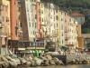 L'antico borgo, ridotto a un campo di rovine verso la fine del 1400, occupava l'area dell'attuale piazza Spallanzani; di esso sono rimaste solo alcune tracce da cui si può dedurre lo schema urbanistico a reticolo con case isolate. Nell'atto di cessione di Portovenere ai Genovesi furono inoltre stabilite norme per l'edificazione delle case-fortezza, le cui fronti non dovevano superare un determinato rapporto con la superficie. La palazzata, continua sul fronte a mare, è dunque costituita da una fitta serie di case a schiera che, non perfettamente allineate tra loro e chiaroscurate da sporgenze e rientranze, evitano, grazie anche alla policromia delle loro facciate, ogni effetto monotono al lungo prospetto. La tipologia dei singoli edifici è quella tipica della casa romanica genovese: essa presenta due accessi a livelli diversi ed indipendenti tra loro, l'uno dal mare l'altro dalla strada interna. Le scale, generalmente ripide, sono rettilinee ed attraversano l'edificio in tutta la sua lunghezza, i vani della parte al di sotto dell'asse stradale, meno profondi, avevano una sola apertura e i locali più bassi servivano generalmente da magazzini e rimessa per le barche. La parte superiore, adibita esclusivamente ad abitazioni, ha finestre su entrambi i fronti ma, data la notevole profondità, il vano centrale risulta buio. Il blocco compatto delle abitazioni è attraversato da anguste gallerie con ripide scale dette "capitoli" che servivano a collegare in modo rapido la marina alla strada centrale. Queste aperture non indebolivano il sistema fortificato perché erano facilmente difendibili, sia per le ridotte dimensioni dello sbocco sulla strada sia perché dotati di feritoie e caditoie.Un discorso a parte deve essere fatto per tutta la zona esterna al vecchio borgo. Purtroppo scelte discutibili delle precedenti giunte, dal dopoguerra fino a pochi anni fa, hanno fatto sì che il paesaggio sia stato pesantemente penalizzato dalle nuove costruzioni, realizzate senza alcun rispetto dell'ambiente e senza alcuna intenzione di mantenere la stessa tipologia edilizia degli edifici già esistenti. Un esempio per tutti è l'attuale palazzo del Comune.